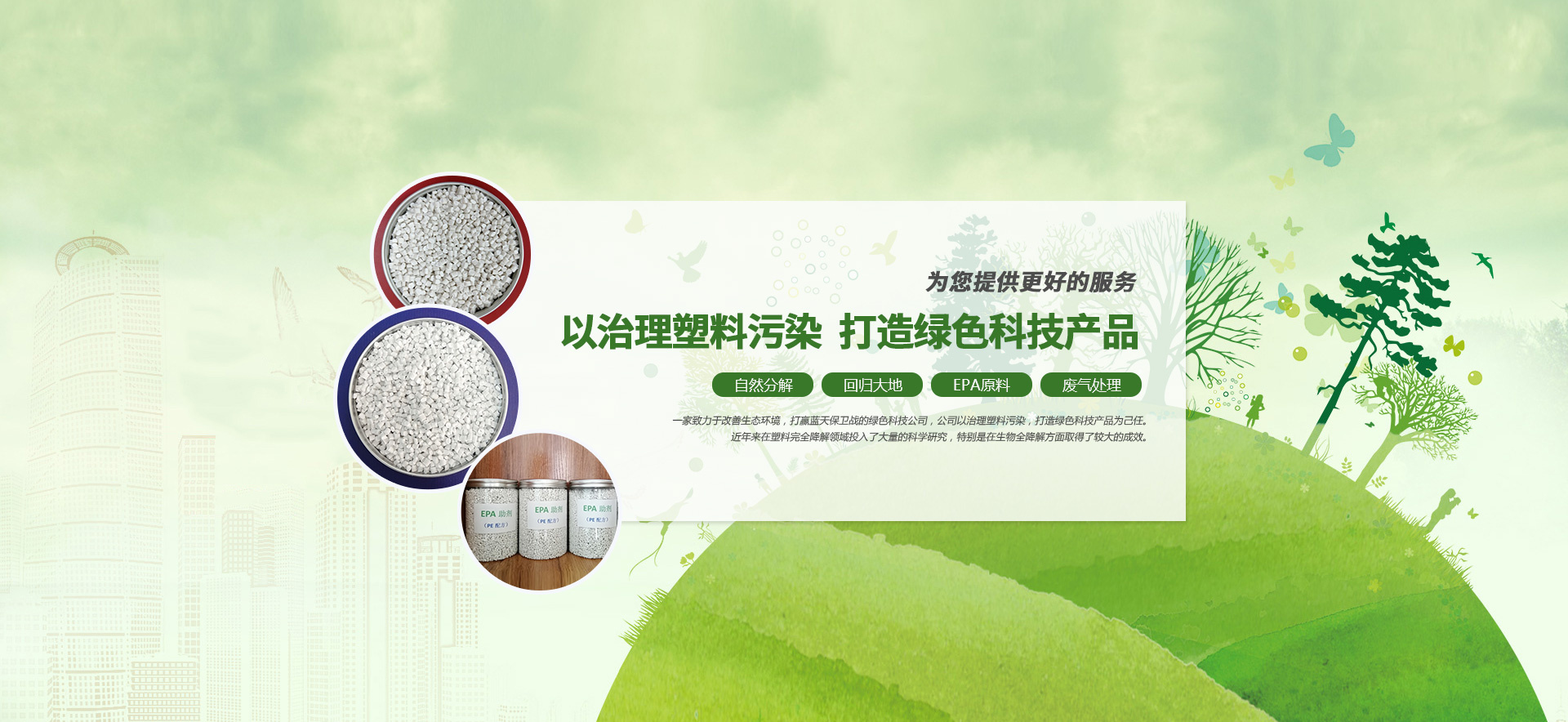 是一家集環保科技產品的研發、制造、銷售、貿易及技術指導為一體的環??萍计髽I公司,研究的產品“塑料生物降解劑(功能性母料)”、“生物降解添加顆?!奔笆褂锰砑印吧锝到馓砑宇w?!焙笏a的可降解塑料產品,得到德國萊茵檢測、SGS 歐盟 REACH 檢測、國塑檢測等國內外多家權威機構的檢測與認證